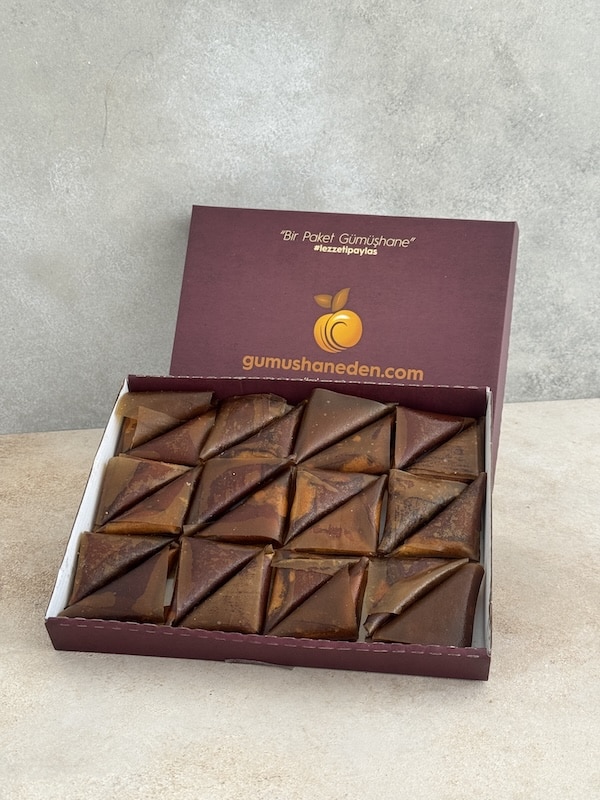 Bu tatlı için özel pestil serilmektedir. İncecik serilen pestil uygun ölçüde kesilir. İçerisine el yapımı özel fındık ezmesi doldurulur ve muska şeklinde katlanır. Çevresi pekmez&bal karışımı ile bulanır ve böylece glutensiz muska tatlısı olarak son halini alır. Glutensiz Muska Tatlısı konuklarınıza rahatlıkla ve güvenle ikram edebileceğiniz bir tatlıdır. Bildiğiniz gibi Gümüşhane, pestil, köme ve tatlılarının ana vatanıdır. Lezzetlerimiz fabrikamızda hijyenik bir şekilde üretiliyor ve taze taze adresinize kadar gönderiliyor. Ayrıca glutensiz glutensiz muska tatlısı ürün hazırlanış videosuna aşağıdan ulaşabilirsiniz.